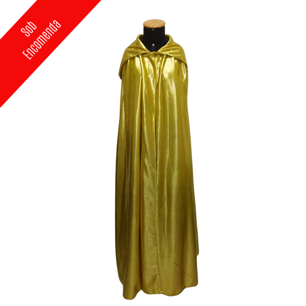 Possui encaixe no ombro facilitando a vestimenta e deixando a capa elegante e alinhada nas vestes. Essa foi confeccionada em lame dourado.