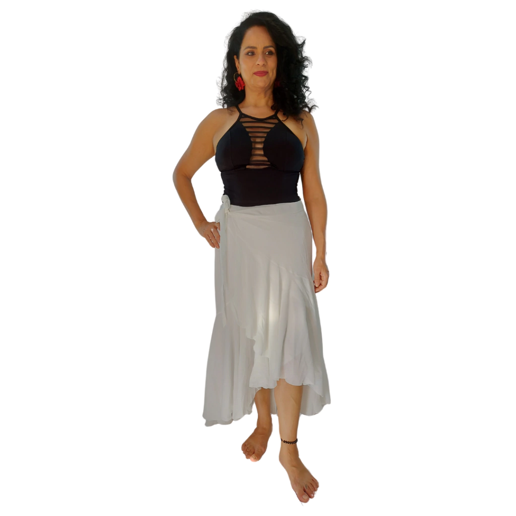 Saia Cigana coleção CASUAL GYPSY , modelo Pareô, confeccionado em crepe e cetim, com forro, cós em tira com transpasse. Peça com costura de alta qualidade.